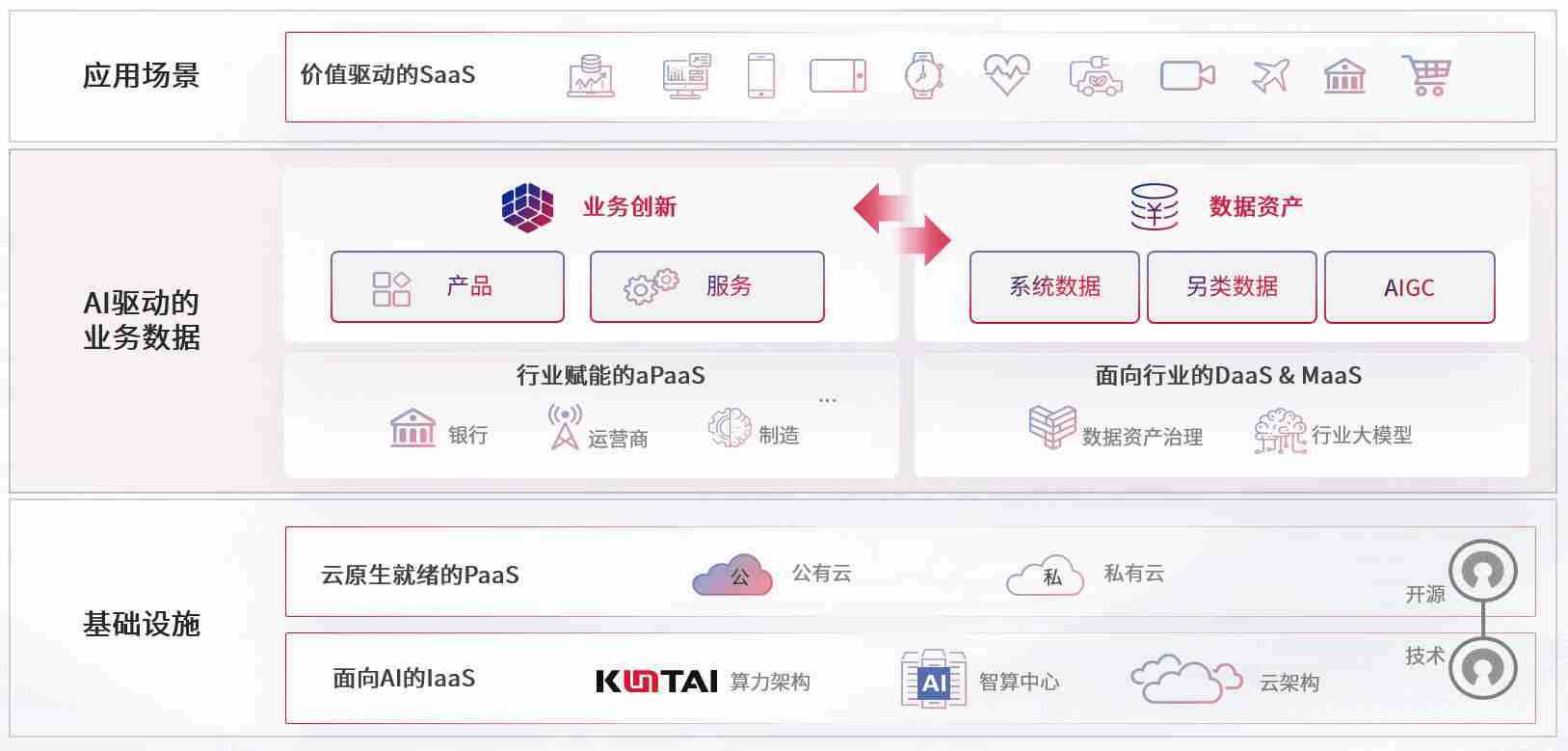 数字时代,,,,围绕企业数字化转型的关键要素,,,,尊龙旗舰厅数码开创性的提出数云融合战略和技术体系框架,,着力在云原生、、、数字原生、、AI原生和信创产业上架构产品和服务能力,,为处在不同数字化转型阶段的快消零售、、、汽车、、、金融、、、、医疗、、、政企、、、教育、、、、运营商等行业客户提供泛在的敏捷IT能力和融合的数据驱动能力,,构建跨界融合创新的数字业务场景和新业务模式,,,,助力企业级客户建立面向未来的核心能力和竞争优势,,,全面推动社会的数字化、、智能化转型升级。。。。