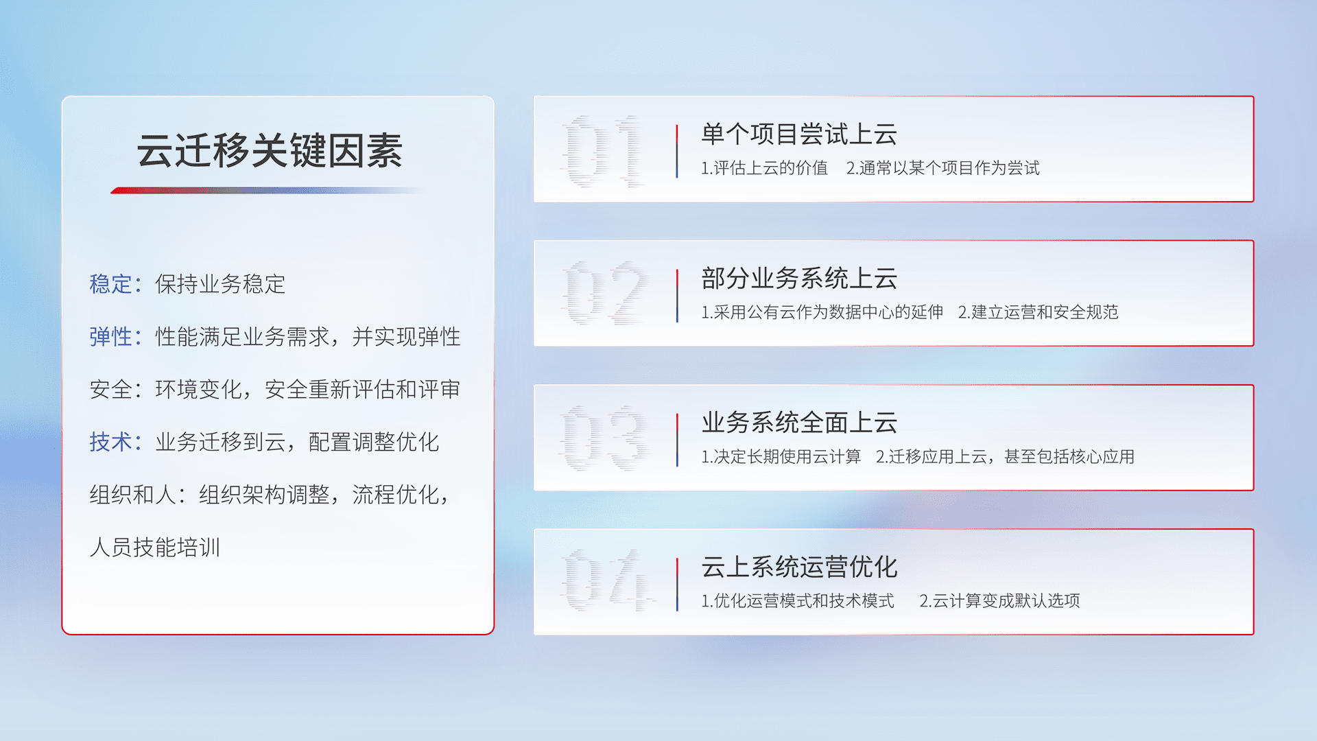 结合实际业务,,从规划设计、、、云平台选型、、云原生改造、、、、数据迁移、、、集成交付,,,迁移全过程为客户识别最佳上云路径,,做好风险识别管理,,,设计网络架构、、身份权限、、、安全审计合规、、、操作审计、、日志审计、、、监控告警策略、、、多站点容灾设计等,,对云上基础设施进行整体规划,,,,提升IT治理水平,,以满足弹性、、、、高可用、、高性能的需求。。。。